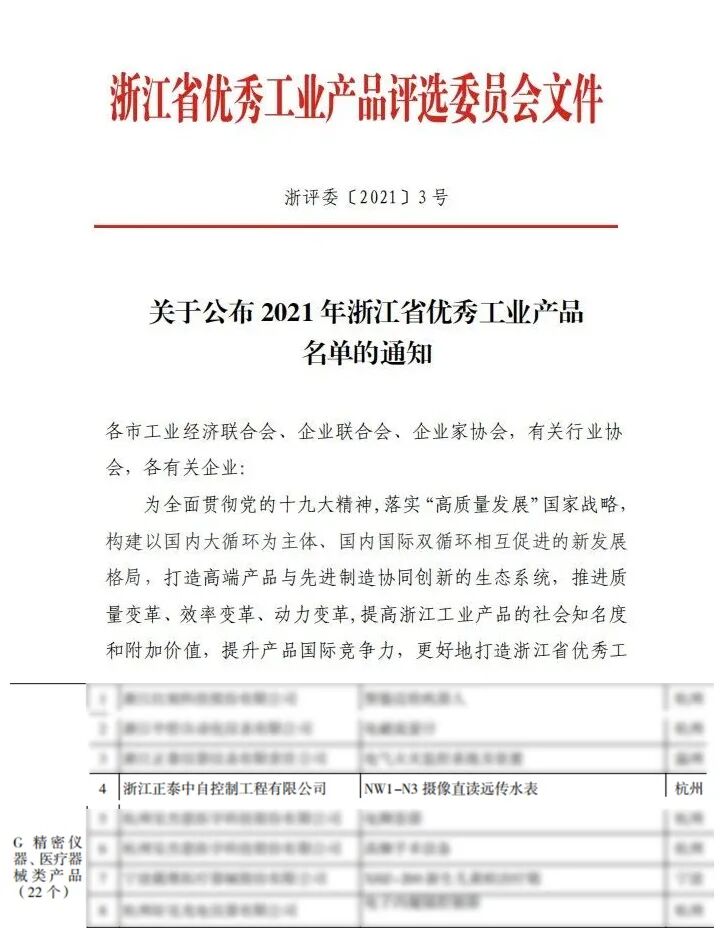 日前,浙江省优秀工业产品评选委员会公布了“2021年浙江省优秀工业产品名单”,浙江省仪器仪表行业协会副理事长单位、杭州市仪器仪表学会理事长单位——tyc7111cc太阳成集团浙江太阳成tyc7111cc集团有限公司的NW1-N3摄像直读远传水表获评“2021年浙江省优秀工业产品”,这标志着该系列产品已成为浙江优质工业代言产品之一,获社会、政府认可。